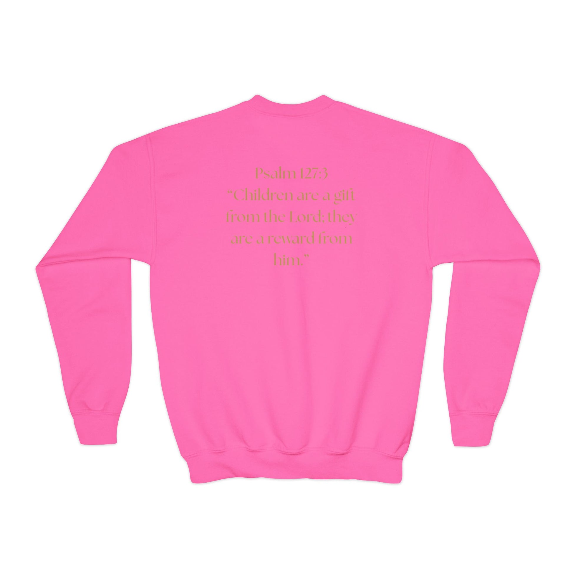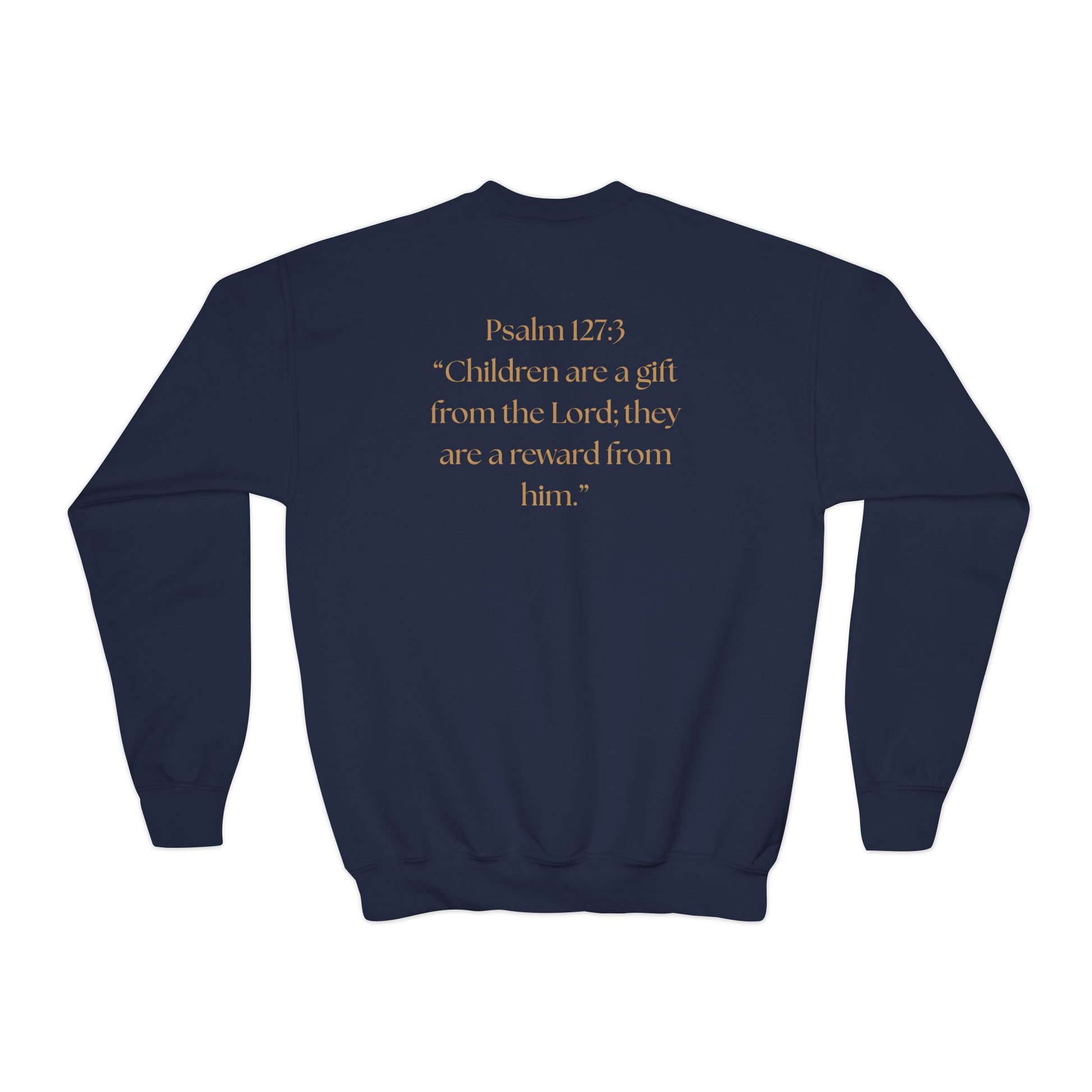 This crewneck sweatshirt carries a quiet confidence — a white-foil lion head and crown on the front, with Psalm 127:3 printed on the back. It feels substantial without being stiff: a medium-heavy 50/50 cotton–poly blend that holds print and embroidery well, knitted as a seamless tube for a clean silhouette. The loose, relaxed cut lets kids move freely while the ribbed collar and cuffs keep shape after washes. It reads like a small declaration of faith and dignity, the kind of piece a family reaches for when they want their child to look and feel honored at church gatherings, family photos, or community events.
