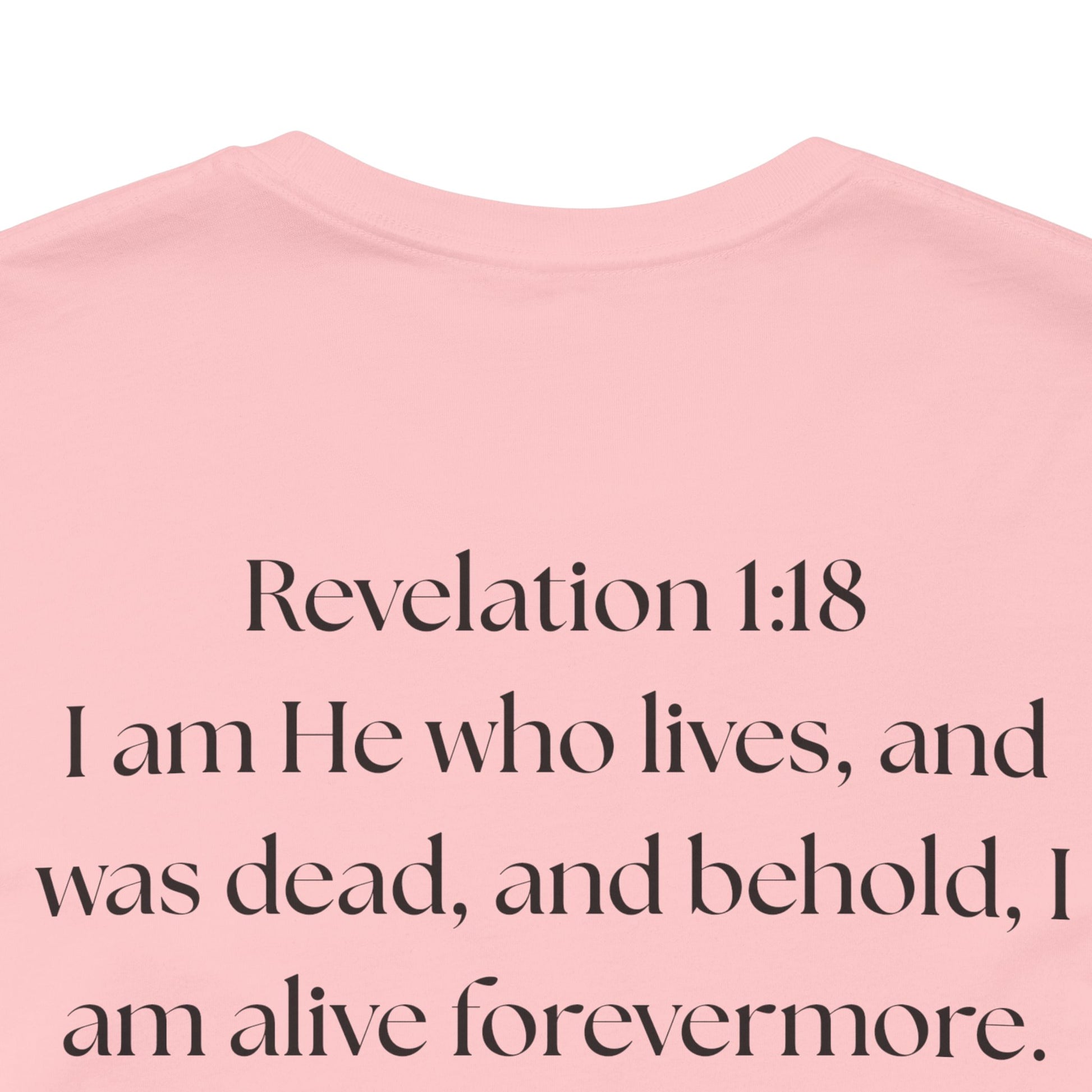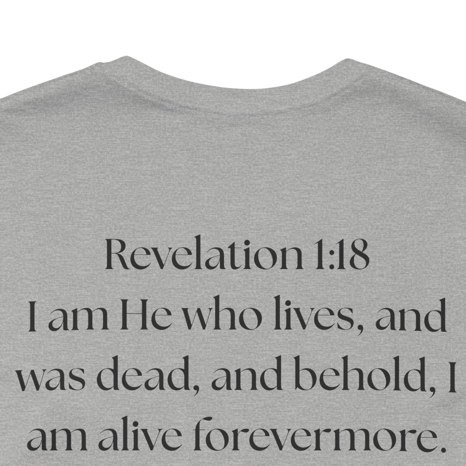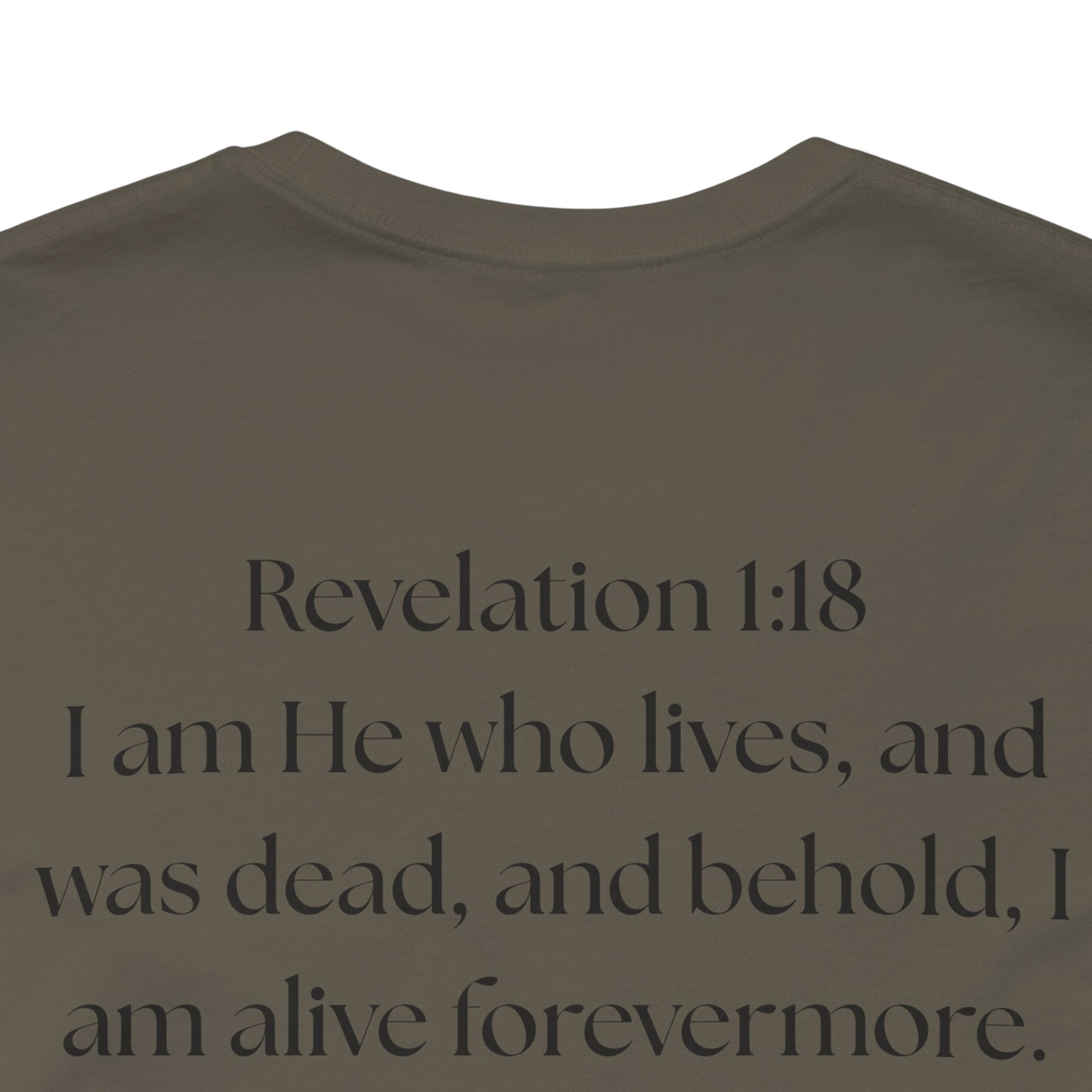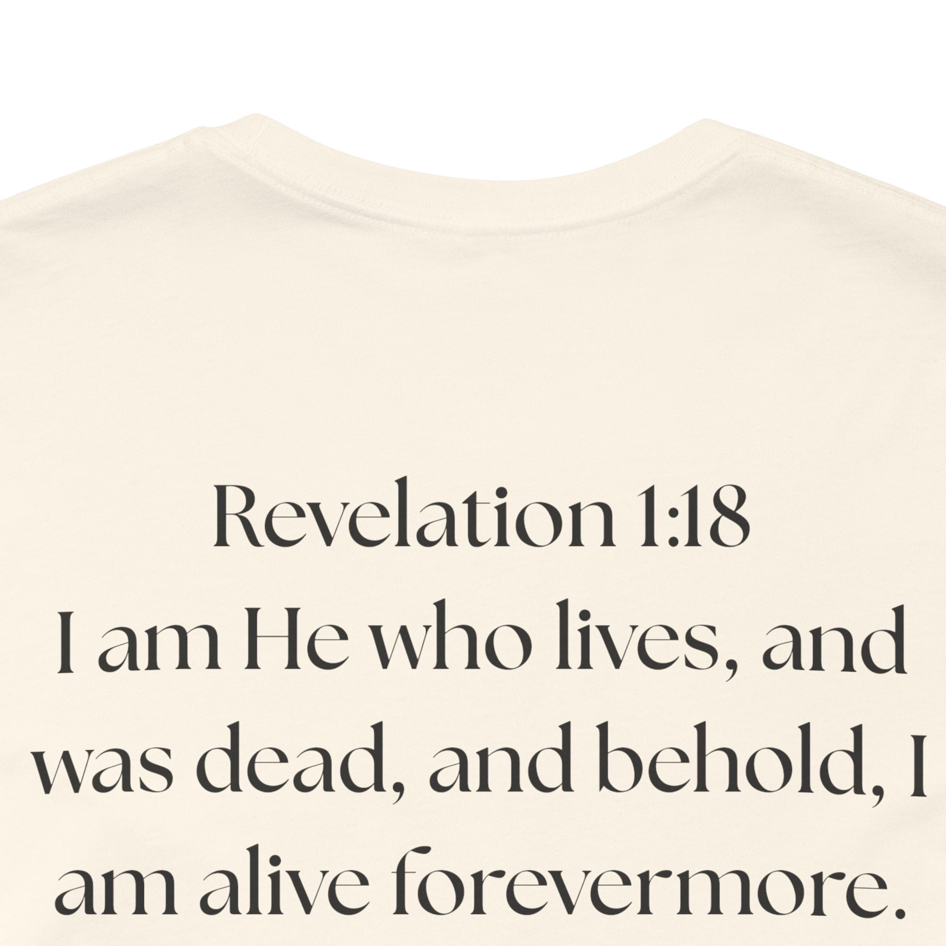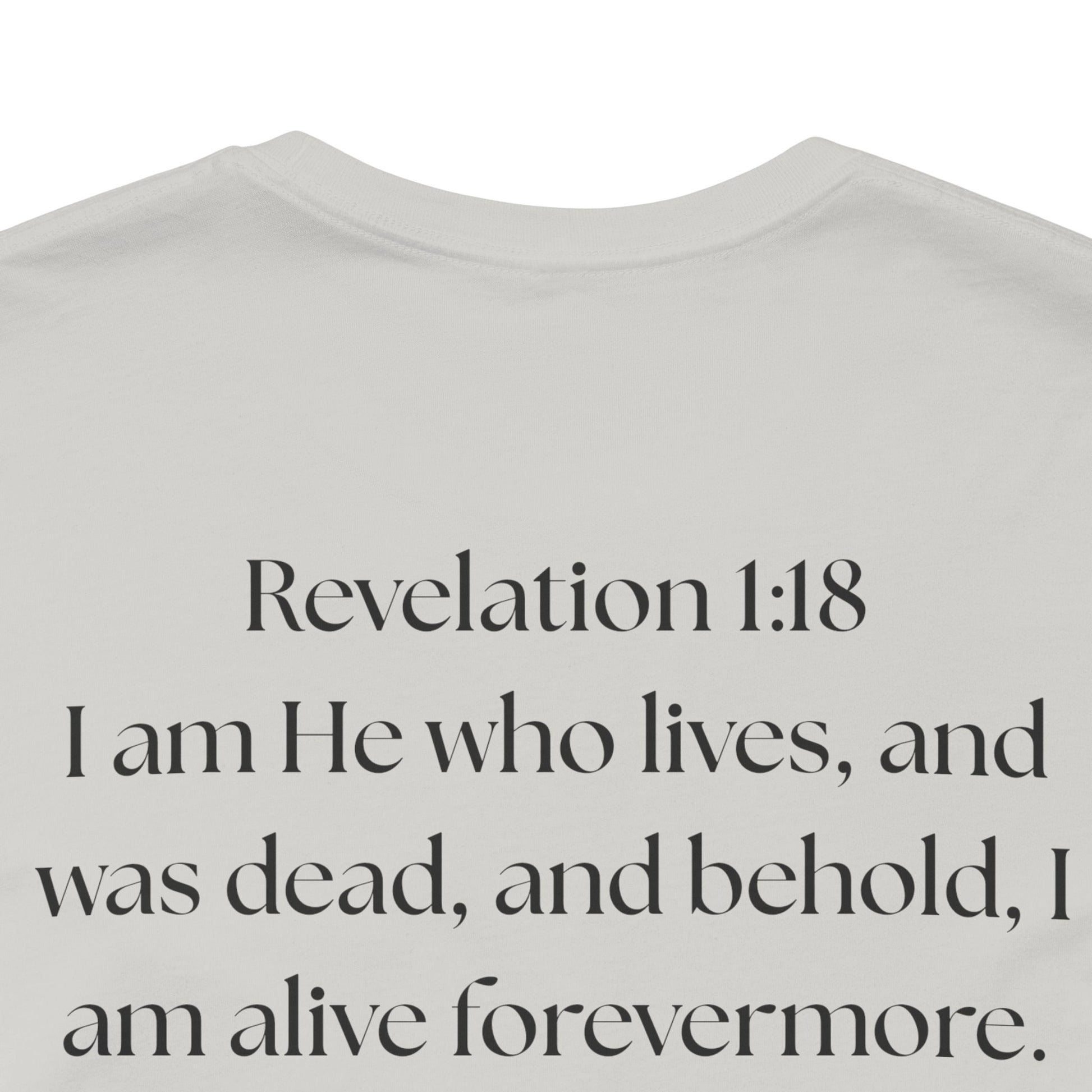This lightweight cotton tee carries a calm, confident faith — quiet artwork of Christ across the chest, balanced by gentle typographic scripture on the back. It wears like a simple staple but speaks softly: a drawn portrait framed by spaced lettering on the front and Revelation 1:18 set in an airy serif across the back. Clean lines and breathable fabric make it easy to layer under a jacket or let stand alone during warm-weather mornings at church, volunteer days, or long drives with worship playing or wherever the Lord leads. The crew neck and retail fit keep the silhouette familiar and tasteful; the subtle sleeve marks add a modern, community-minded touch without shouting for attention. It’s for whoever wants to carry their belief with dignity and calm — not loud, just steady.
